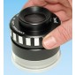 For viewing negatives, color slides and microfilms having extended areas. Optically corrected for astigmatism and curvature of field as well as aberrations of the image of the central image. Complete with detachable metric scale, 54 mm long in 0.1 mm increments.