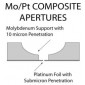 We are pleased to introduce a new line of sub micron apertures. Manufacture of apertures less than 1 micron in diameter is made possible by the development of composite apertures consisting of a molybdenum (Mo) support with a thin sheet of platinum (Pt) foil fused to the surface. The sturdy Mo support contains a visible counterbore to simplify locating the very small aperture hole.